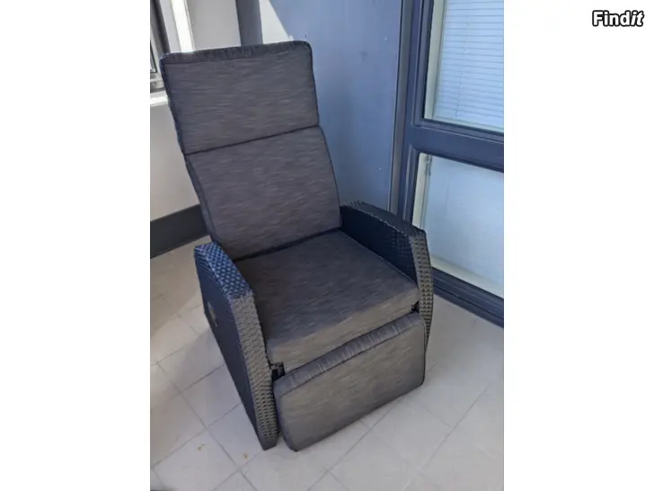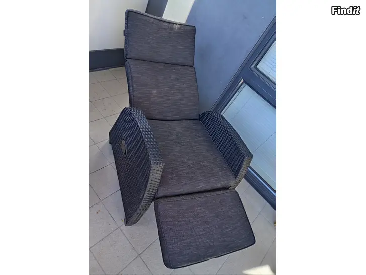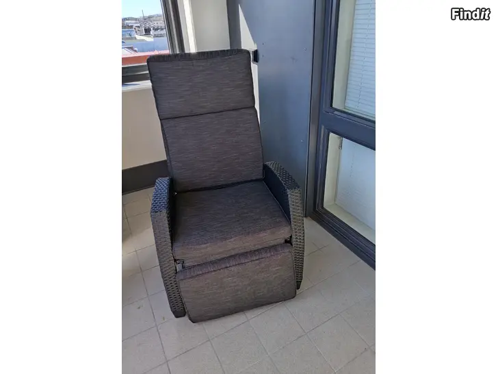 Tummanharmaa lepotuoli, jossa on korkea selkänoja ja säädettävä selkä- ja jalkatuki. Istuinosassa ja selkänojassa on pehmustetut kangaspäälliset. Käsinojat ja runko ovat polyrottinkia, joka soveltuu hyvin parvekkeelle tai terassille. Tuoli tarjoaa istuma- ja lepoasennon säädettävän mekanismin avulla.