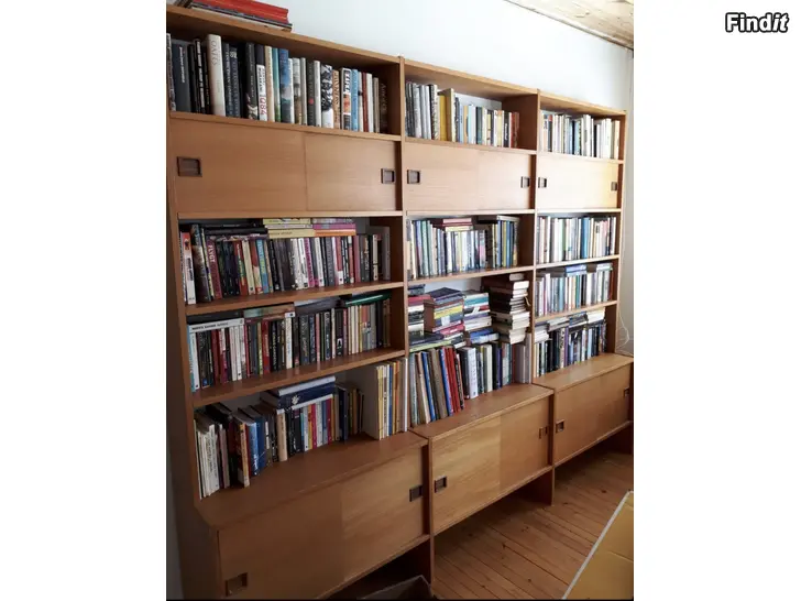 En stor bokhylla i teak får hämtas mot ett kaffepaket.