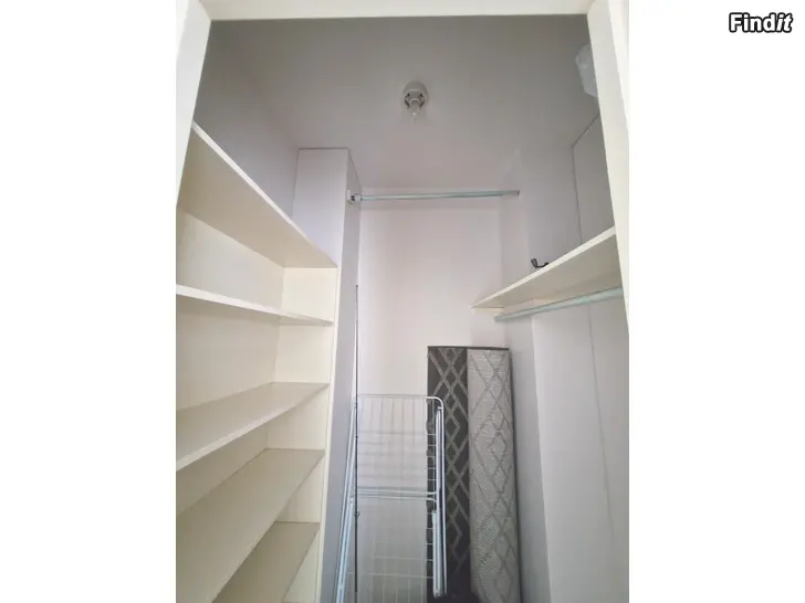 Asunnossa tiskikone, pesukoneliitäntä ja suuri vaatehuone.