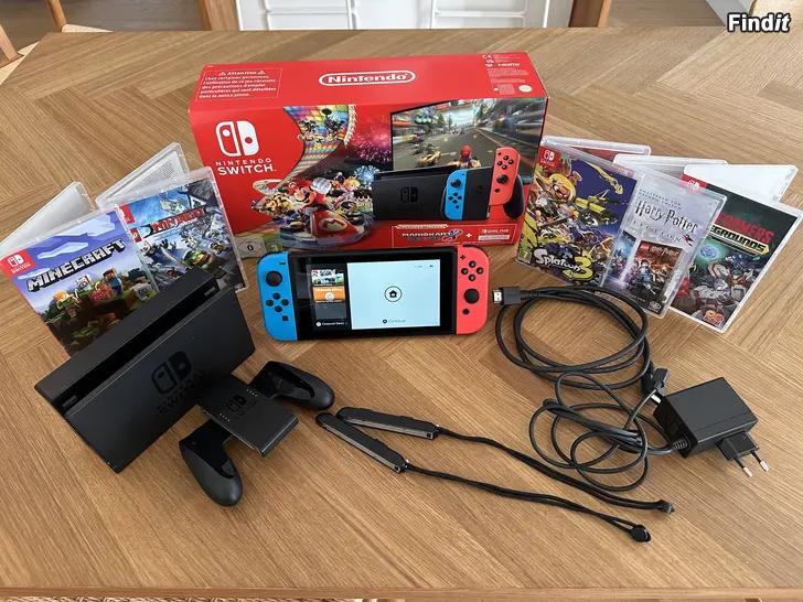 Nintendo Switch -pelikonsoli neonpunaisilla ja neonsinisillä Joy-Con-ohjaimilla. Mukana telakka, Joy-Con-ohjainpidike, rannekkeet, HDMI-johto ja virtalähde. Kuvissa näkyy lisäksi useita pelejä erillisissä koteloissa. Konsolia voi käyttää sekä telakoituna televisioon liitettynä että käsikonsolina irrotettavien Joy-Con-ohjainten kanssa.