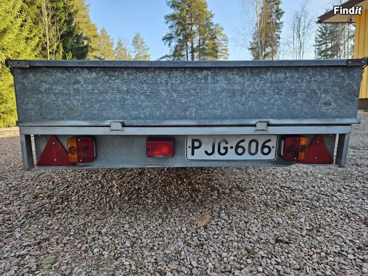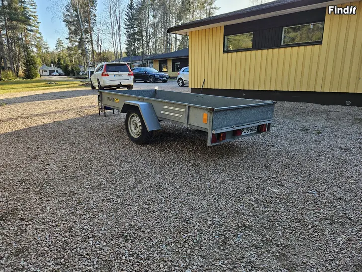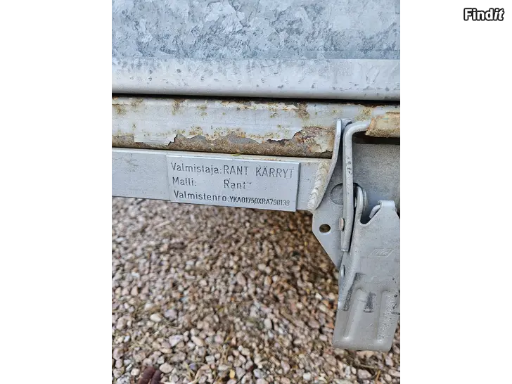 Rant Kärryt Rant peräkärry. Sinkitty, harmaa teräsrakenteinen perävaunu, jossa on yksi akseli ja laidallinen tasainen kuljetuslava. Soveltuu erilaisten kuormien, kuten rakennus- ja pihatarvikkeiden, kuljettamiseen henkilöauton perässä. Kärryssä on takavalot ja heijastimet sekä vetokita auton vetokoukkuun kiinnittämistä varten. Valmistajan ja mallin tiedot löytyvät tyyppikilvestä rungosta.