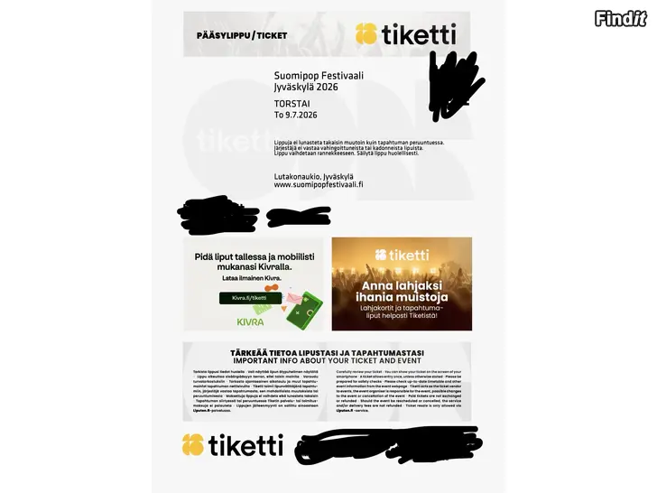 Myydään tarpeettomaksi jäävä suomipop festivaali torstai päivän lippu Jyväskylään,lippu pdf:nä.