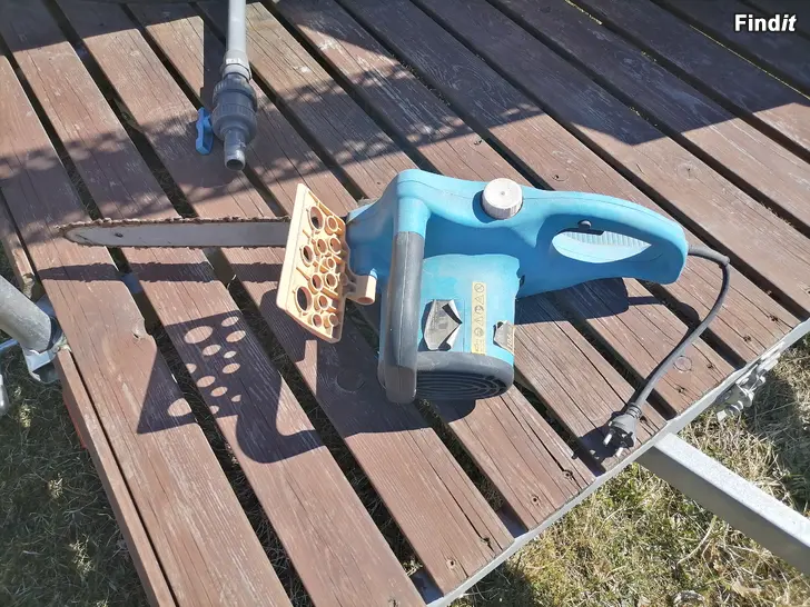 Royal sähkömoottorisaha kotipihan ja puutarhan sahauksiin. Johdollinen sähkökäyttöinen ketjusaha, jossa sininen runko. Soveltuu esimerkiksi polttopuiden ja oksien katkomiseen. Pistin töpselin seinään ja käynnistyi, mutta pitää ainakin öljytä, on seissyt käyttämättömänä kauan. Hae Vaasasta, Vetokannas.