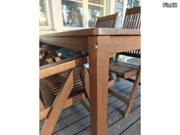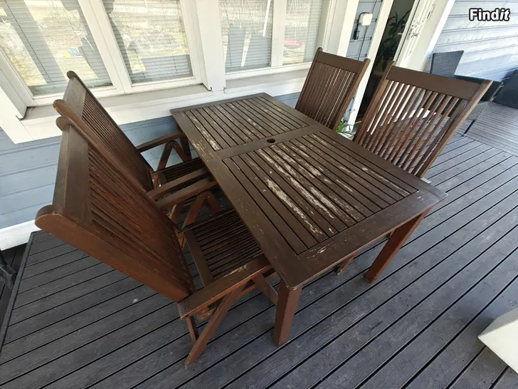 Myydään reilu 10v vanha puinen puutarhapöytä ja neljä tuolia. Nämä on ostettu aikoinaan Jyskistä.