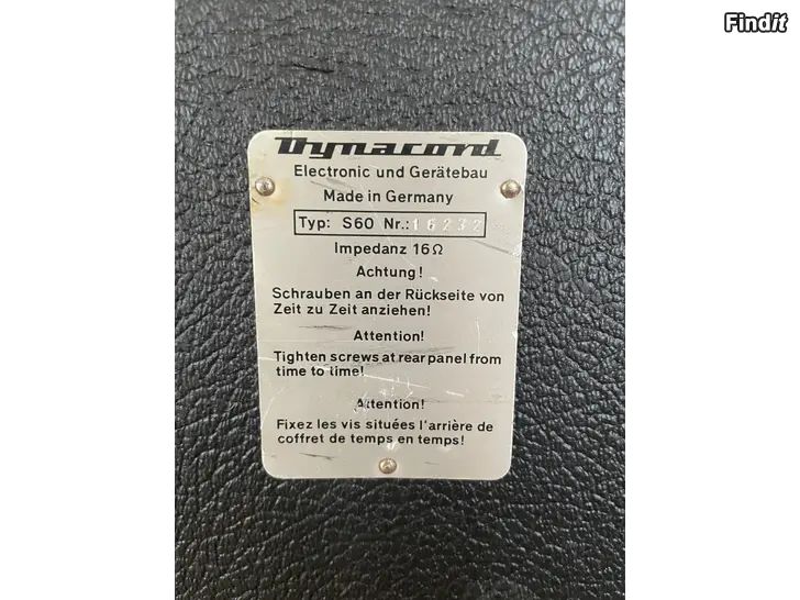 70-luvun klassinen Dynacord S60 kaiutinkaappi, 16 Ω. Valmistettu Saksassa. Sivussa kantokahva helpottamassa siirtämistä. Sopii käytettäväksi esimerkiksi kitaravahvistimen kanssa.