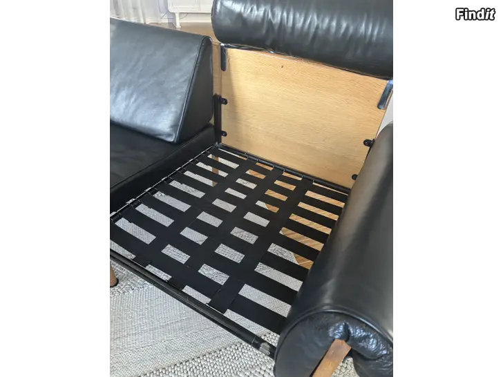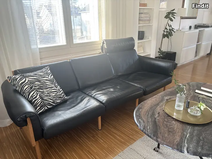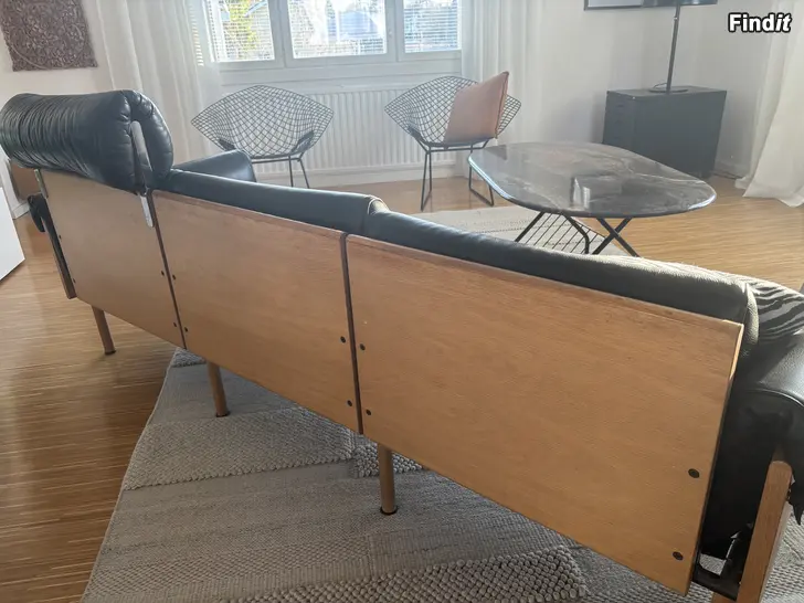 Yrjö Kukkapuron Haimi Ateljee 3-istuttava sohva, Mustanahka ja ruusupuurunko, istuin ja selkänosan nahat uusittu n.3 vuotta sitten. Laadukas! Löytyy 3kpl alkuperäistä niskatukea, missä alkuperäinen nahka. Kuvissa, meillä käytössä vain yksi niskatuki.