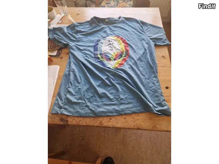Säljer en ljusblå t-shirt med ett stort tryck av ett alienhuvud i flera färger på bröstet. Trycket har inslag av rött, grönt, blått och gult samt japansk text i mitten. T-shirten har rund hals och korta ärmar. Perfekt för dig som gillar unika och coola motiv.