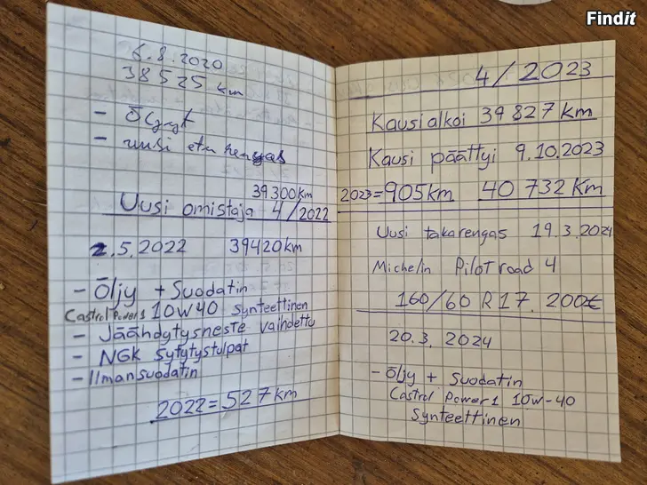 Huollot: jäähdytysnesteen vaihto, sytytystulpat ja ilmansuodatin 2022. Uusi Michelin-takarengas 2024. Öljy + suodatin vaihdettu 2024. Uusi akku 4/2026.