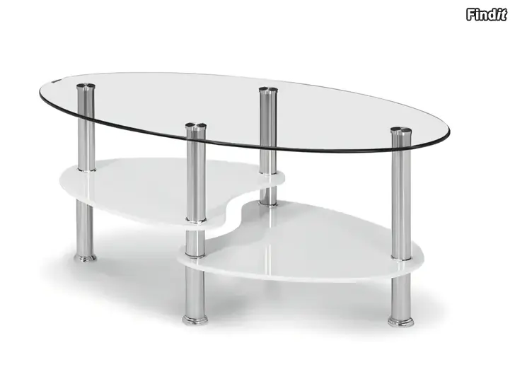 Kirkas lasikansi. Alapuolella on kaksi vaaleaa hyllyä. Pöydän runko on kromattua metallia, hyllyt valkoisia, korkeakiiltoisia.