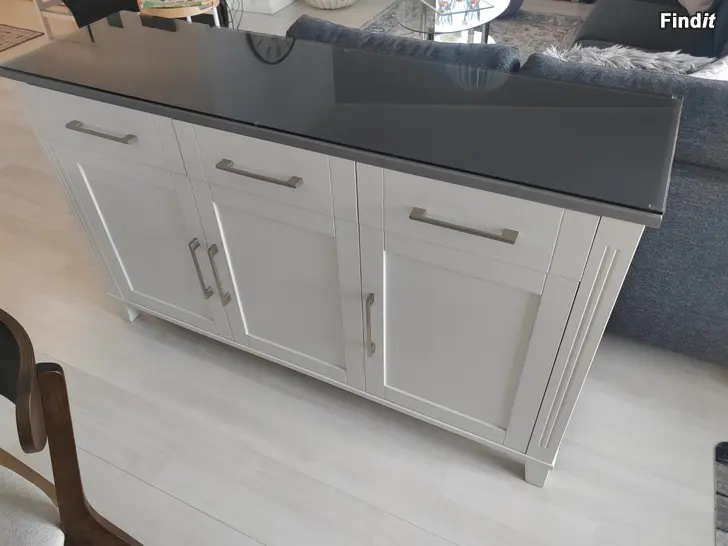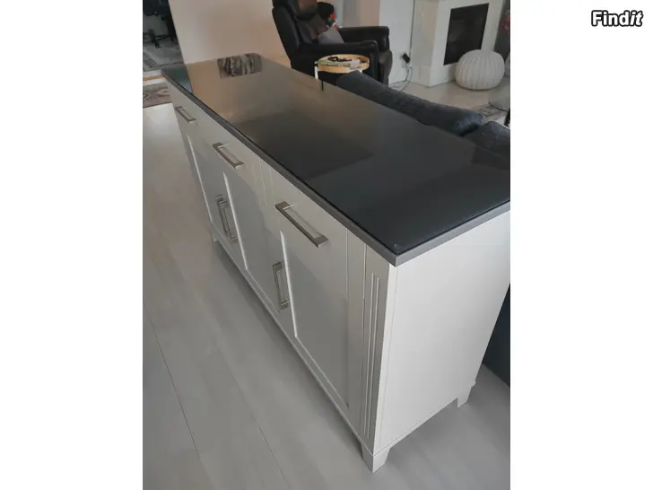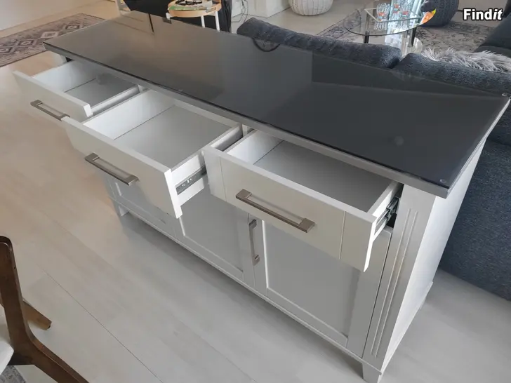 Hyväkuntoinen senkki mihin teetetty lasikansi jälkikäteen.