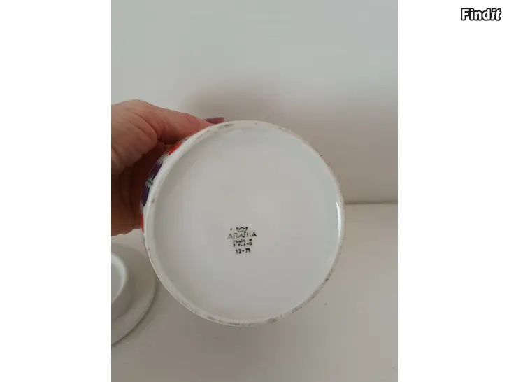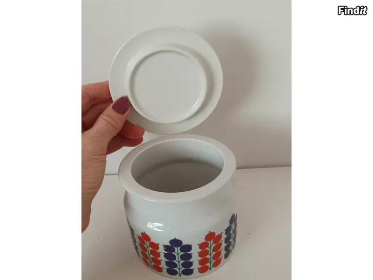 Tämä on klassinen Arabian Pomona-sarjan purkki, jossa on Raija Uosikkisen suunnittelema Herukka-kuvio.