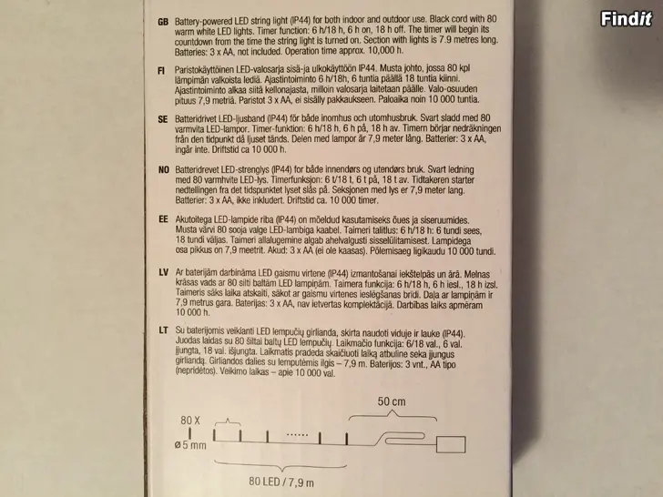 Säljes en extra ny batteridriven ljusslinga med 80 varmvita led lampor. Lampdelens längd 7,9 meter. Mysbelysnings ljus för inom och utomhusbruk. On/off timer funktion som lyser 6 timmar från då man sätter på dem. Öppnad testad enligt bild o. de fungerar lyser. Säljes utan batterier.