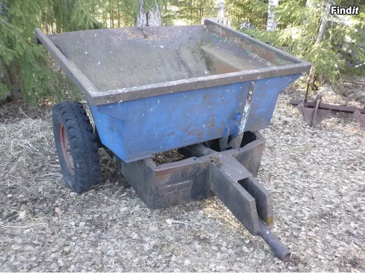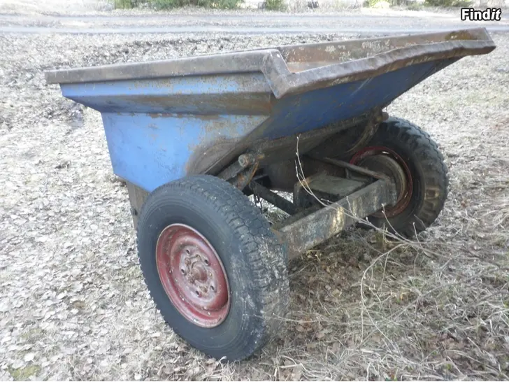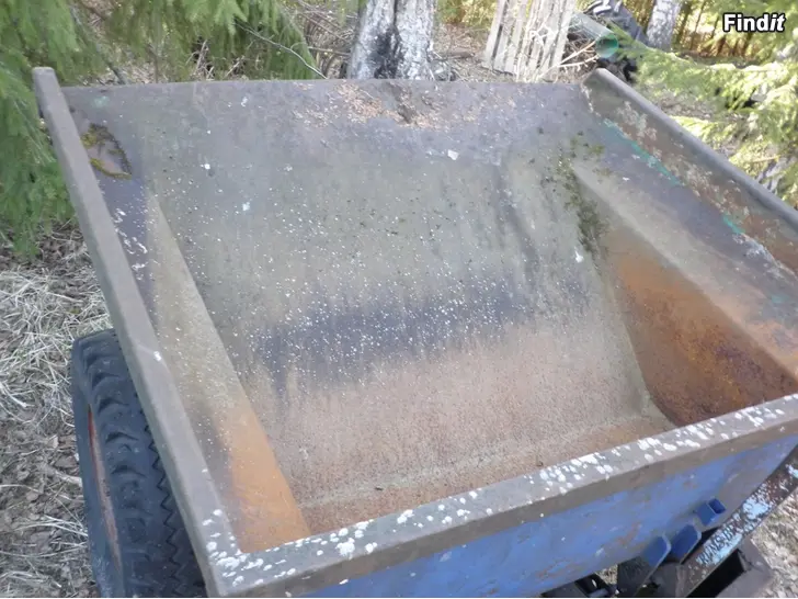 Kippaava. Vahvatekoinen dumpperikärry. Lavan mitat: leveys 162cm, pituus 140cm ja syvyys 55cm.