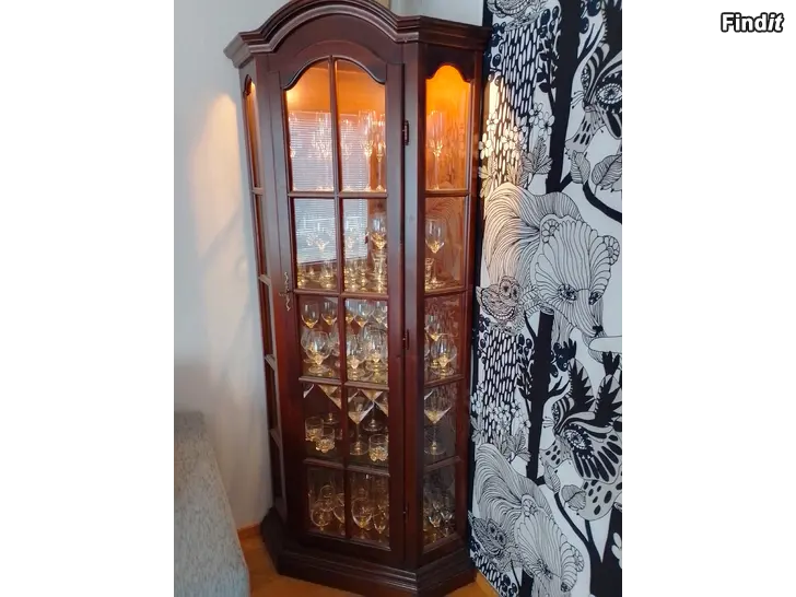 Vitrinskåp, hörnmodell, med inbyggd lampa och 4 glashyllor säljes. Pris 150 €