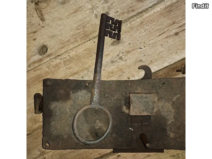 Antikt äkta handgjort lås med i efterhand gjord 42 cm lång nyckel från sädesmagasin till salu. Storlek 60x30 cm. Vikt 16,2 kg.