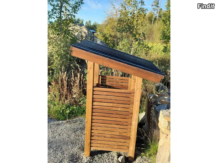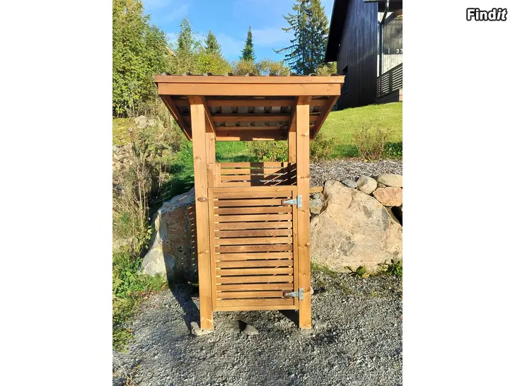 Robust ställning för sopkärl, med dörr. I sin helhet av tryckimpregnerat virke, förutom taket av plåt förstås.