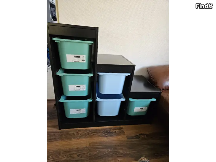Ikea trofast med 6 lådor med lock och finns nya skenor ifall man vill köpa mindre lådor och lägga dit. Lite använd. 90 euro. Hämtas från smedsby