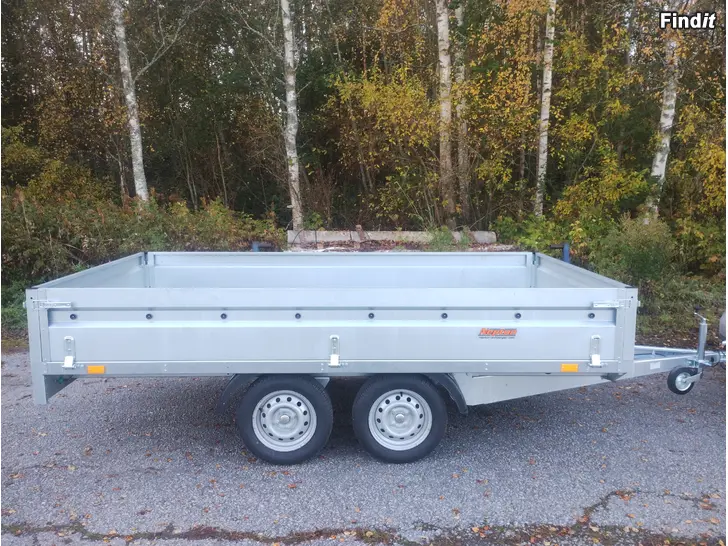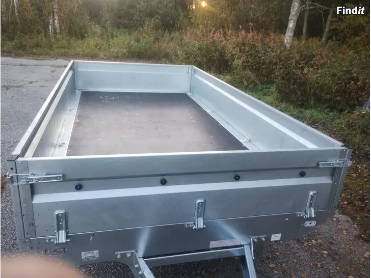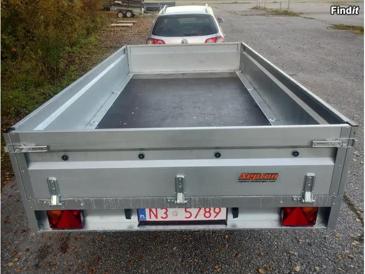Neptun obromsad bilsläpvagn, flakmått 319x168cm. Egenvikten är 300kg. Lastvikt 450kg + 75kg. Nedfällbara och löstagbara sidor underlättar lastning från alla sidor. Sidorna är 40 höga. Priset innehåller moms och registrering. Tar även hem andra märken och modeller vid behov, bl.a. Boro Niewiadow, Faro och Temared.
