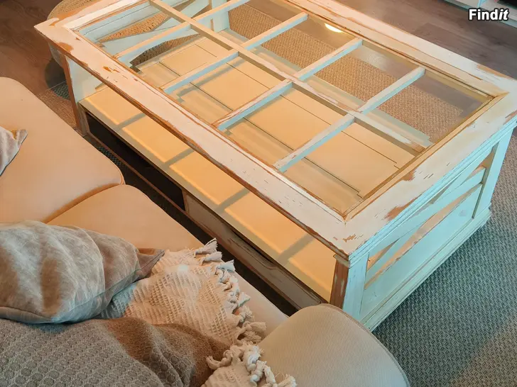 Säljer vårt uppskattade soffbord i rustik stil, vit/beige färg. Stadigt och rejält, men ändå lätt att flytta eftersom glasskivan enkelt kan lyftas av.