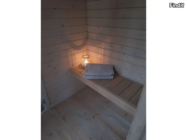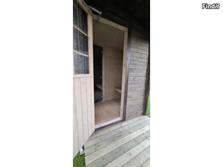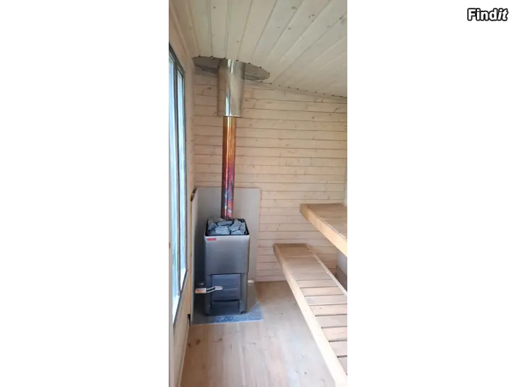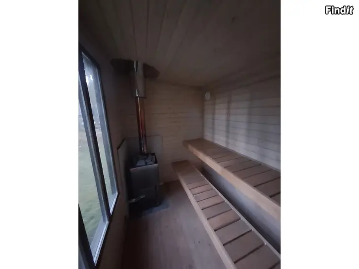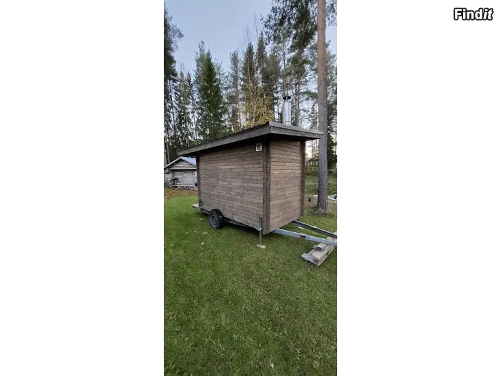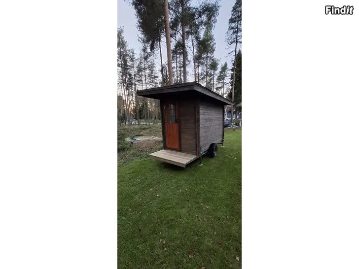 Liten bastu som är byggd på ett husvagns underrede. Går att skruva loss om man inte vill ha den på hjul. Bastun är timrade på 45x95. Har bara kört några hundra meter med den efter vägen,men kanske bäst att frakta den med något annat när man flyttar den.