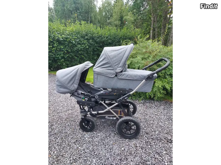 Emmaljunga Super Viking med ligg- och sittdel samt Go Double adaptrar. Köpt och ibruktagen 2018, använt av två barn. I fint skick förutom en liten nötning på läderhandtaget. Alla hjul förnyade en gång. Vintersovpåse som passar till sittdelen samt ett regnskydd fås med om man vill.