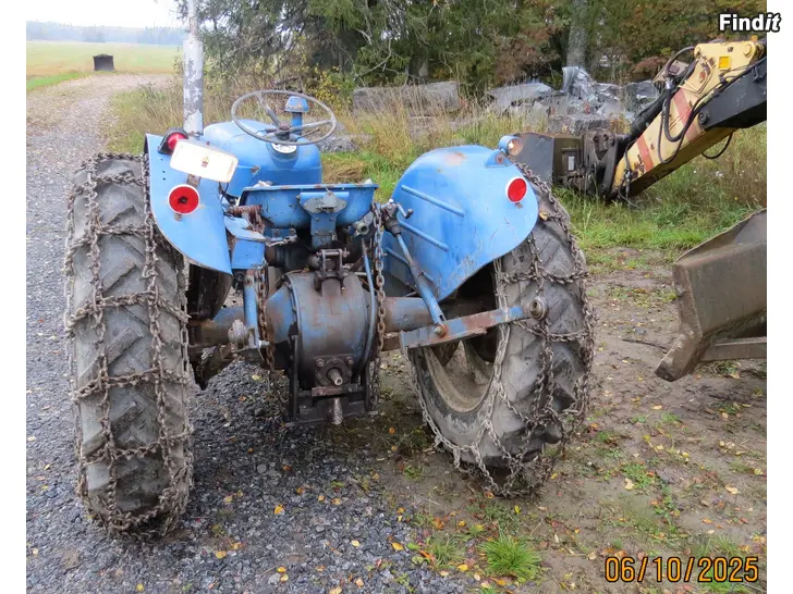Liten å nett Dexta med kättingar kan köpas av någon med intresse för gamla traktorer. rett nya fram däck