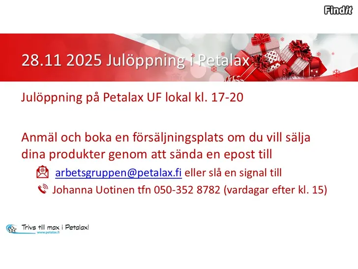 Anmäl och boka en försäljnings plats om du vill sälja dina produkter genom att sända en epost till arbetsgruppen@petalax.fi eller slå en signal till Johanna Uotinen tfn 050-352 8782 vardagar efter kl. 15