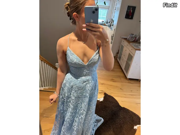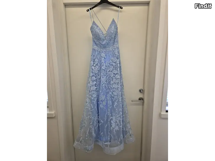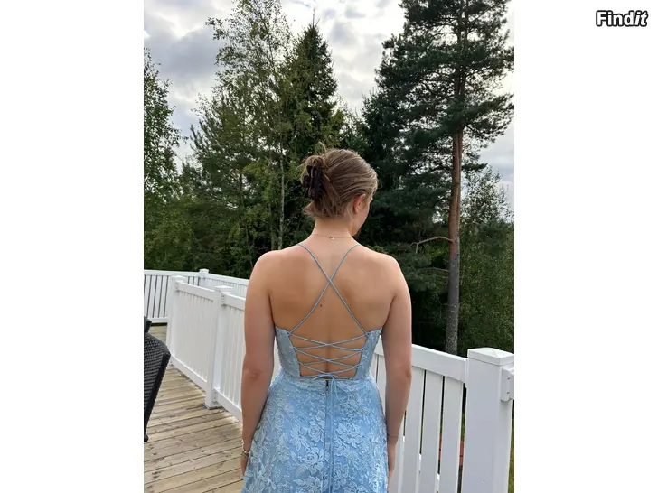 Vacker ljusblå klänning med snörning i ryggen. Modellen är 17o cm lång och klänningen kan förlängas/förkortas. Klänningen är köpt i butik Miobella i Seinäjoki och klänningen är använd endast en gång. Storlek 36