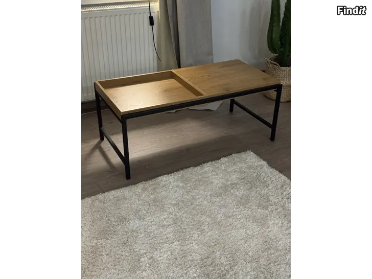 Säljer mitt soffbord i massiv ek med svart metallram. Bordet är i mycket gott skick utan några skador eller märken. Stilren och tidlös design som passar de flesta hem.