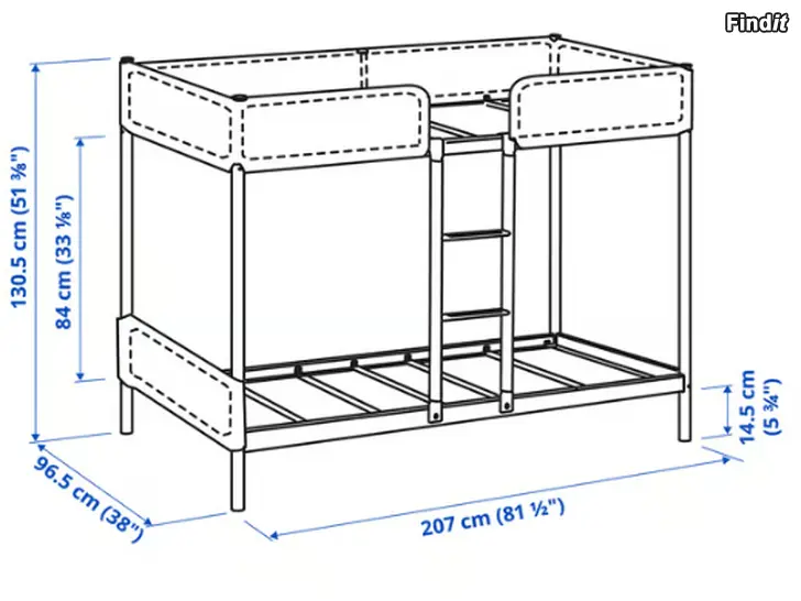 Ikea våningssäng, använts på sommarstället ett antal somrar, felfritt skick. Säljes utan madrasser, endast ramen. Måtten syns på ena bilden. Nedmonterad för tillfället. Hämtas från Tjöck eller fås till Vasa vid behov.