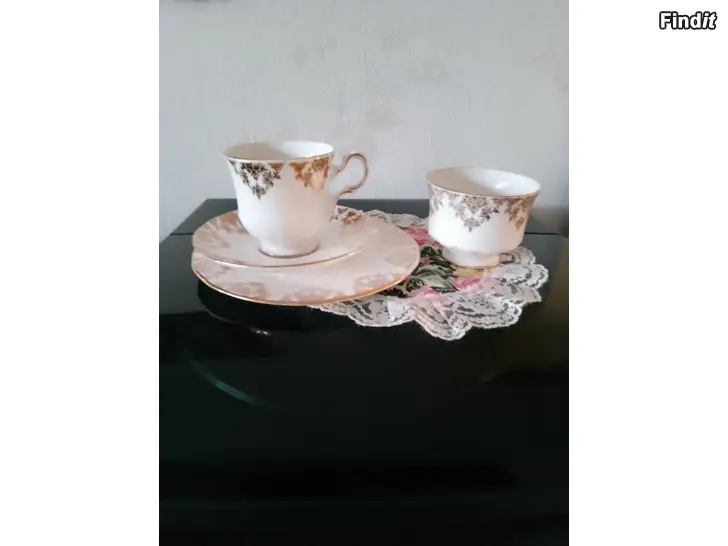 2 st kaffekoppar med fat och assietter samt sockerskål