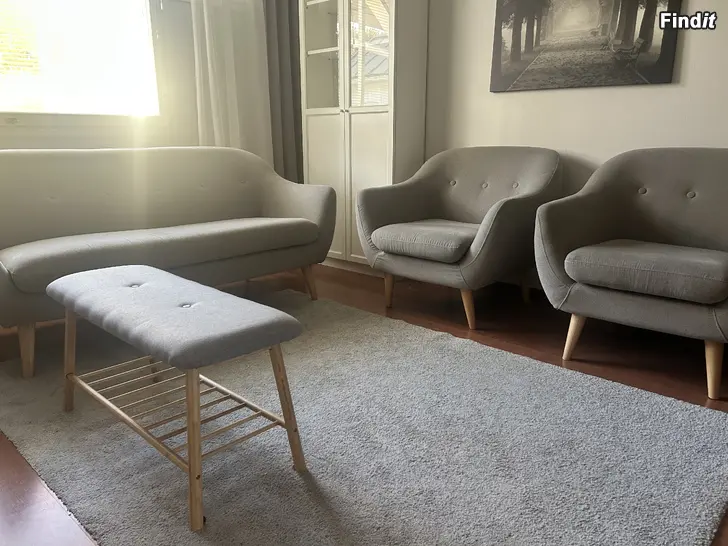Soffa och två fåtöljer, plus bänk och matta säljes som obehövliga.