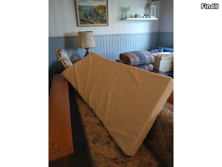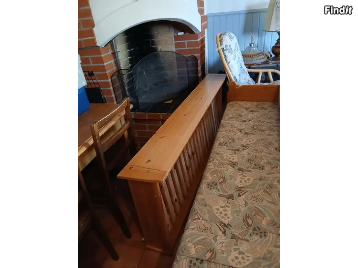 Bäddsoffa med hjulförsedd låda under. Ett hjul lossnat, finns i behåll. Madrass finns till lådan och den kan därför fungera som en mindre, extra säng.