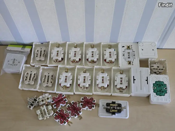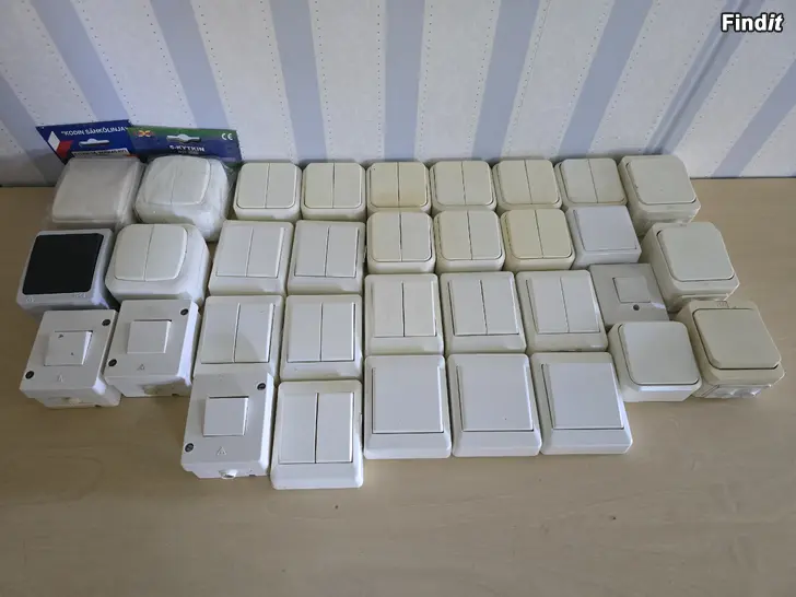 El brytare och stickkontakter för inomhus bruk. Passar utmärkt för garaget eller uthus. Bild 1-2. Alla för 20€ Bild 3. Alla för 35€ Bild 4. Alla 8st för 12€ Bild 5. Alla för 5€
