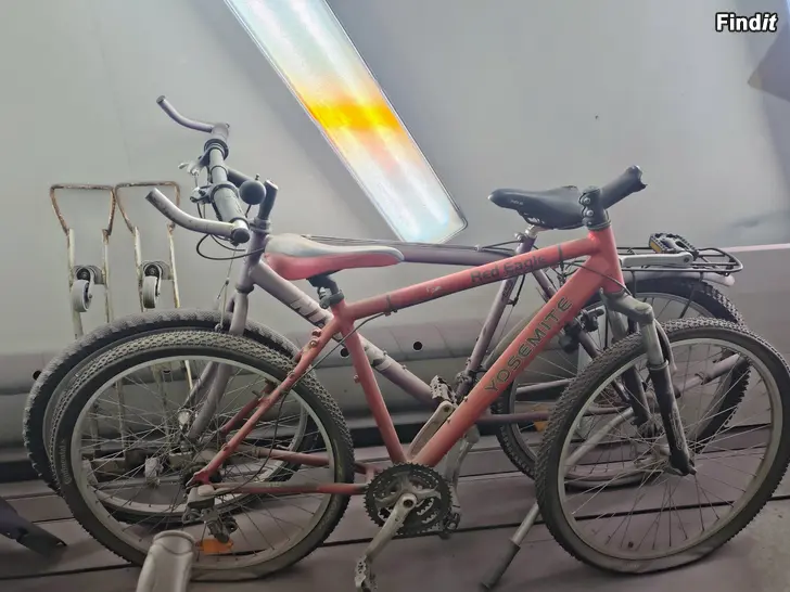 Säljer avstannade cykleprojekt. Den gröna går att använda och de andra två är projekt. Behöver få bort dem ur garaget så 20€ för alla 3