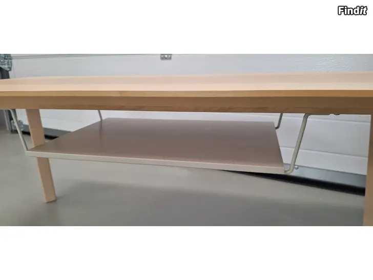 Ikea Lisabo tv-bord delvis i massivt trä. Kanterna på bordsytan är skadade på två ställen. Annars i nyskick. Mått 450x1140x400. Konsolhyllan 88x500x320.