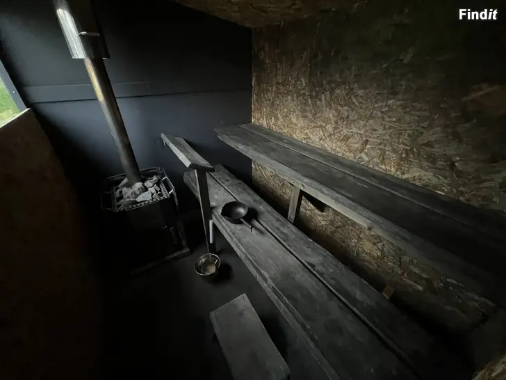 Den är ca 5,5 x 3,1 m invändigt, varav 2,6 x 2,2 m är själva bastun. Den är inte det vackraste i nuläget, men den fungerar utan problem, isolerad och ”löylyvalmis”k. Med lite renovering kan man få till en bra produkt.