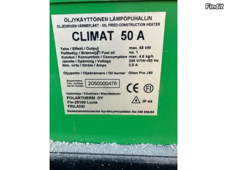 Hallvärmare 50kw, Oilon junior Pro J50 oljebrännare. Max 58kW. 3000 m3/tim. 1fas 10A säkring räcker. Max förbrukning 4,8kg/tim. 6m skorstenrör 200mm och 1,2 m värmekanal 300mm medföljer. Pris: 1000€ + moms. Ny motsvarande Talhu Climat 50, 3800€ +moms. Tel: 0500 794440