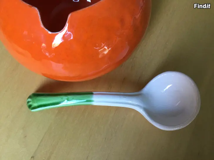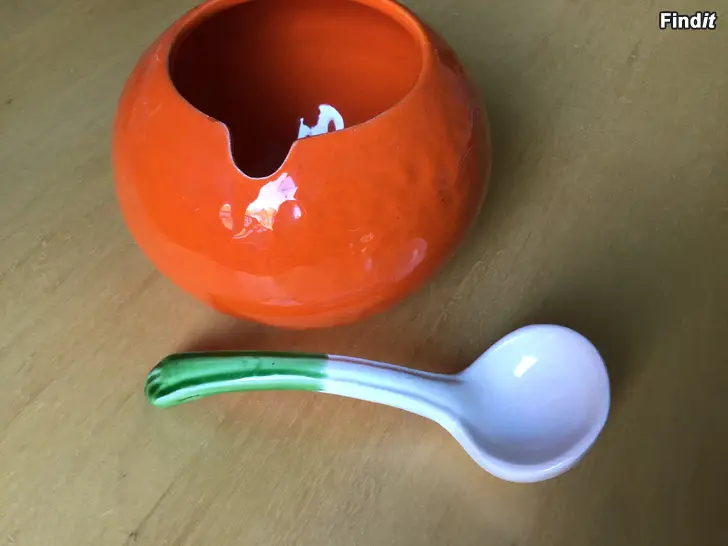 Vacker och ovanlig skål med tillhörande sked i porslin.. ca 8cm hög, pumpa el apelsin..? Helt felfri.