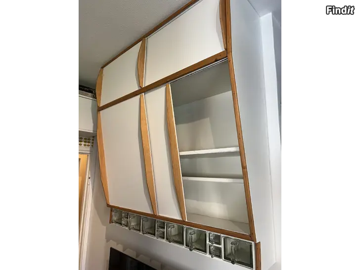 Mycket välbevarat köksskåp från tidigt 50-tal med underbara glaslådor för kryddor och torra varor. Perfekt även för sommarstugan. Tillverkat av trä och fanér. Förvarats inomhus.