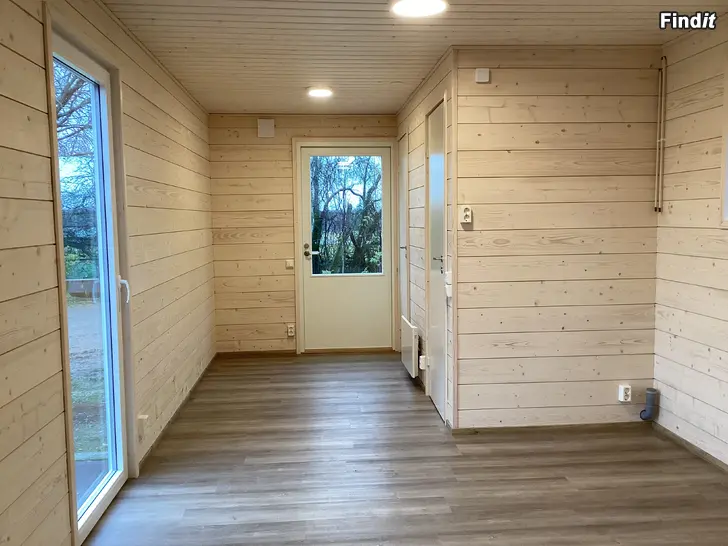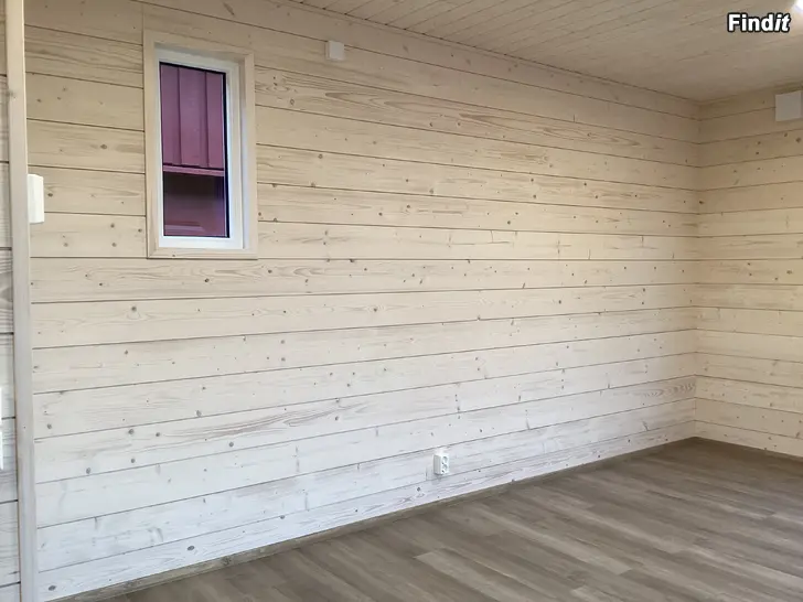 Lähes kaikki sisäpinnat uutta. Seinät suoraa hirsipaneelia, katto kuusipaneelia, lattia vinyylilankkua, wc- ja suihkulattiat muovimattoa. Kuvissa suunnitelma pohjaratkaisusta, monipuolisella keittiöllä.