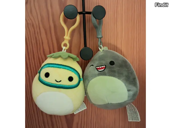 Kaksi suloisen pehmeää Squishmallows klipsipehmoa, koko noin 9 cm. Kiinnitä vaikka reppuun.