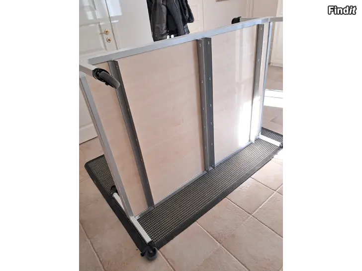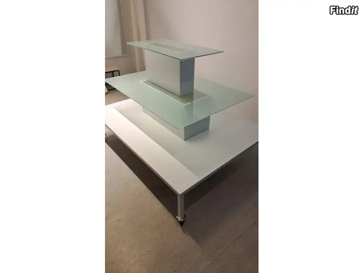 Stabila butiksmöbler på hjul, 2 st. Säljs antingen styckvis eller båda tillsammans. längd150 x bredd 110 och höjd 38 cm från golv till första nivån. Nivåerna och glasen ovanför den nedre våningen kan tas bort. I motsats till bilderna så är trädelarna i original björkfärg.se sista bilderna. Mycket gott skick. Pris/styck 30 €.