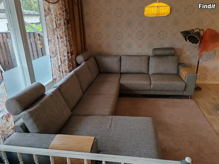 Stor hörnsoffa i ljusgrått tyg. I mycket gott skick, 4 år gammal. Inga husdjur, småbarn eller rökning i hemmet, sittdelen årligen tvättad med våtdammsugare. Löstagbara kuddfodral. 3 flyttbara nackstöd. Armstöden har löstagbara träskydd. Soffan går att plocka isär till 4 delar vid förflyttning.