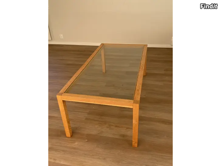 Soffbord i ek med rejäl glasskiva. Mått: 140x70, höjd 50 cm.