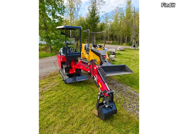 Uthyres grävmaskin och hjullastare. Minigrävaren har 3 olika skopor och 200 mm jordborr. Minimi hyrtid, 2 dygn. Pris 90 €/dygn/maskin inkl.moms