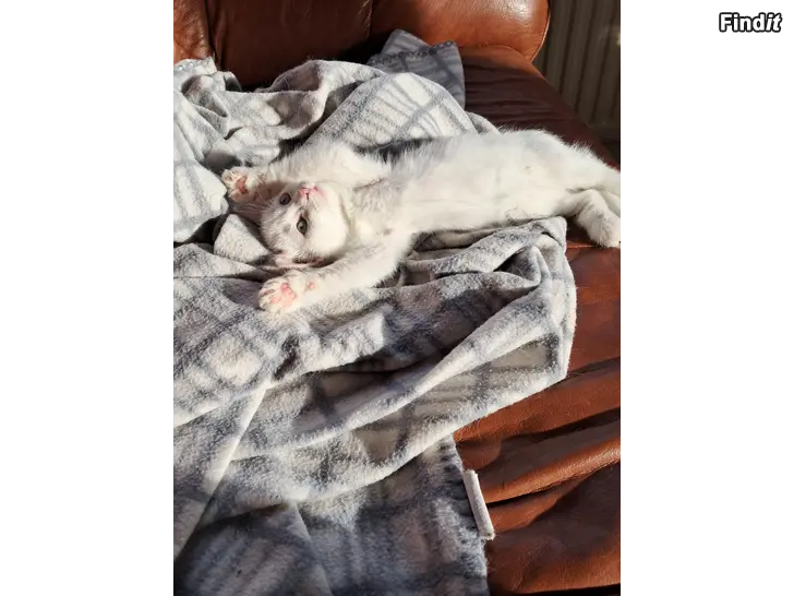 Dumle har ett grönt öga och ett blått och hon är inte döv,för hon är lite försiktigare och rädd för dammsugaren,men också väldigt social och busig.