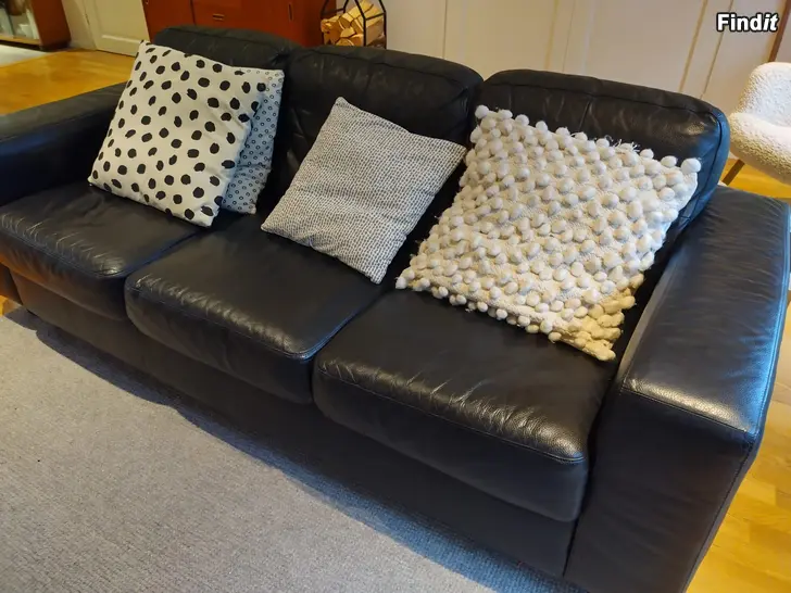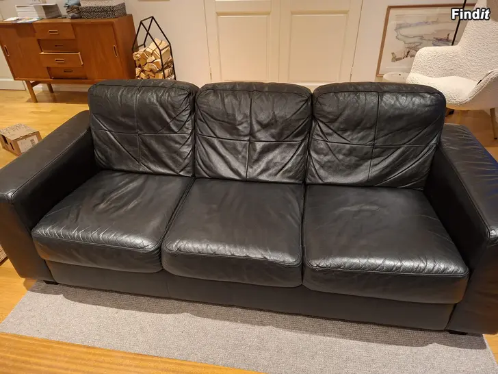 Säljer: 3-sits Ikea Skogaby soffa i svart läder. Bredd 202 cm, djup 85 cm, höjd 80 cm. I gott använt skick. Bekväm att sitta i och lätt att hålla ren. Finns i Jakobstad.