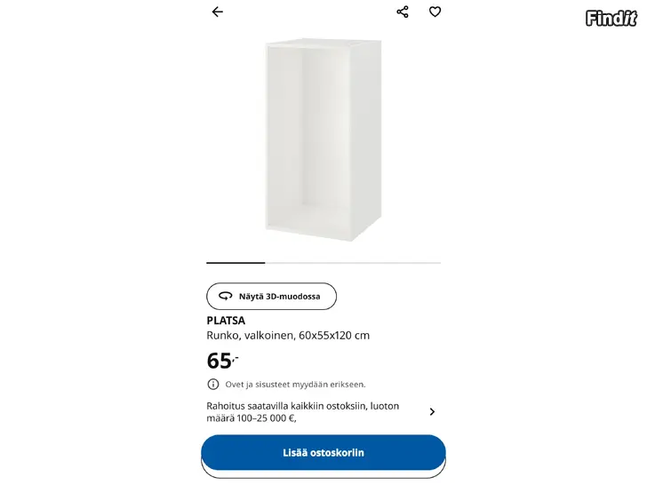 Skåp från Ikea. Modellen heter Platsa. Mått finns på bilderna. Två hyllplan finns på insidan av skåpet. Knappt använt. Enkelt att ändra inredning och bygga med fler moduler om man vill. Säljes som obehövligt.