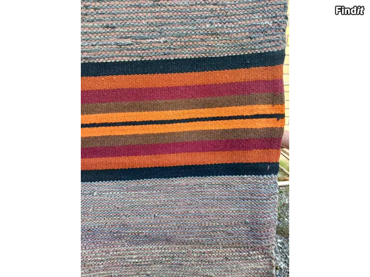 Gammaldags hemvävd gångmatta i bra skick. Längd 380 cm, bredd 75 cm. Fyra ränder, 66 cm mellan. Varje rand 27 cm bred.